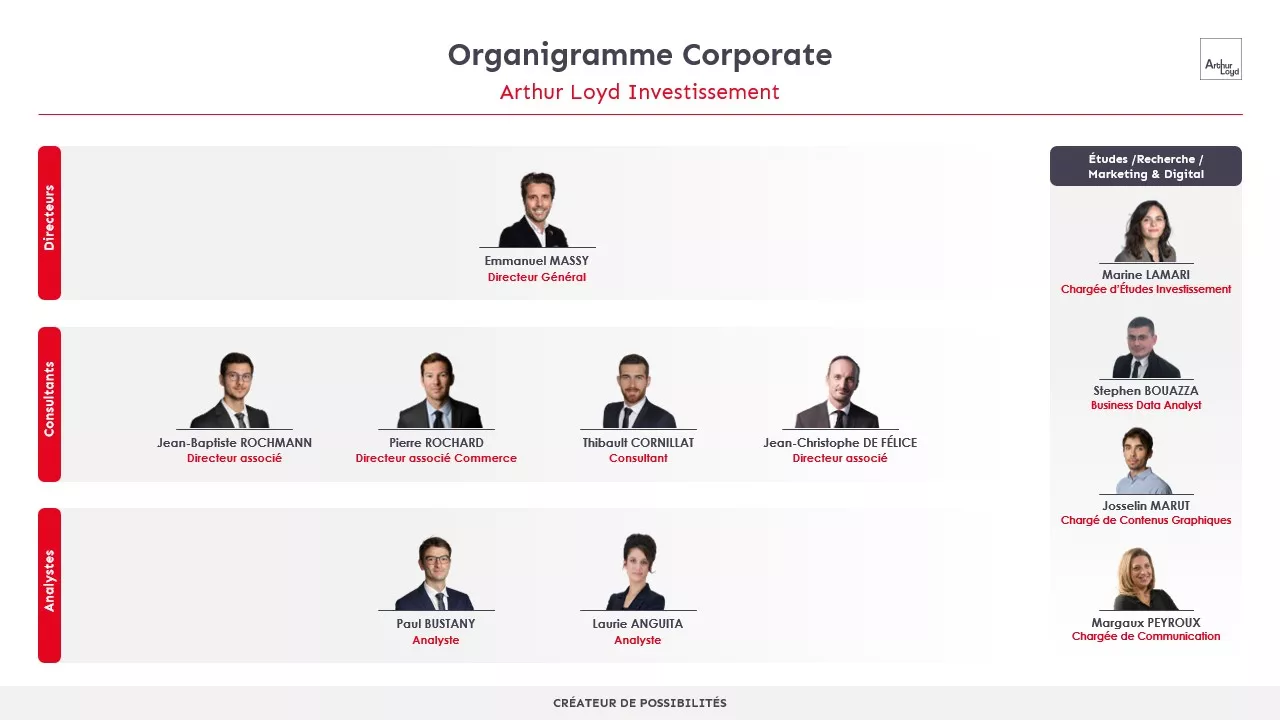 En 2021, Arthur Loyd Investissement s’est totalement réinventé avec une équipe de 10 personnes, dirigée par Emmanuel MASSY dont cinq brokers (Thibault Cornillat, Jean-Christophe de Felice, Jean-Baptiste Rochmann, Pierre Rochard et Thierry Juteau), 5 analystes (Rémi Sayar, Laurie Anguita, Stephen Bouazza, Paul Bustany et Valérie Lam), une chargée d’études (Marine Lamari) sur une triple compétence bureaux / commerces / parcs d’activité.
