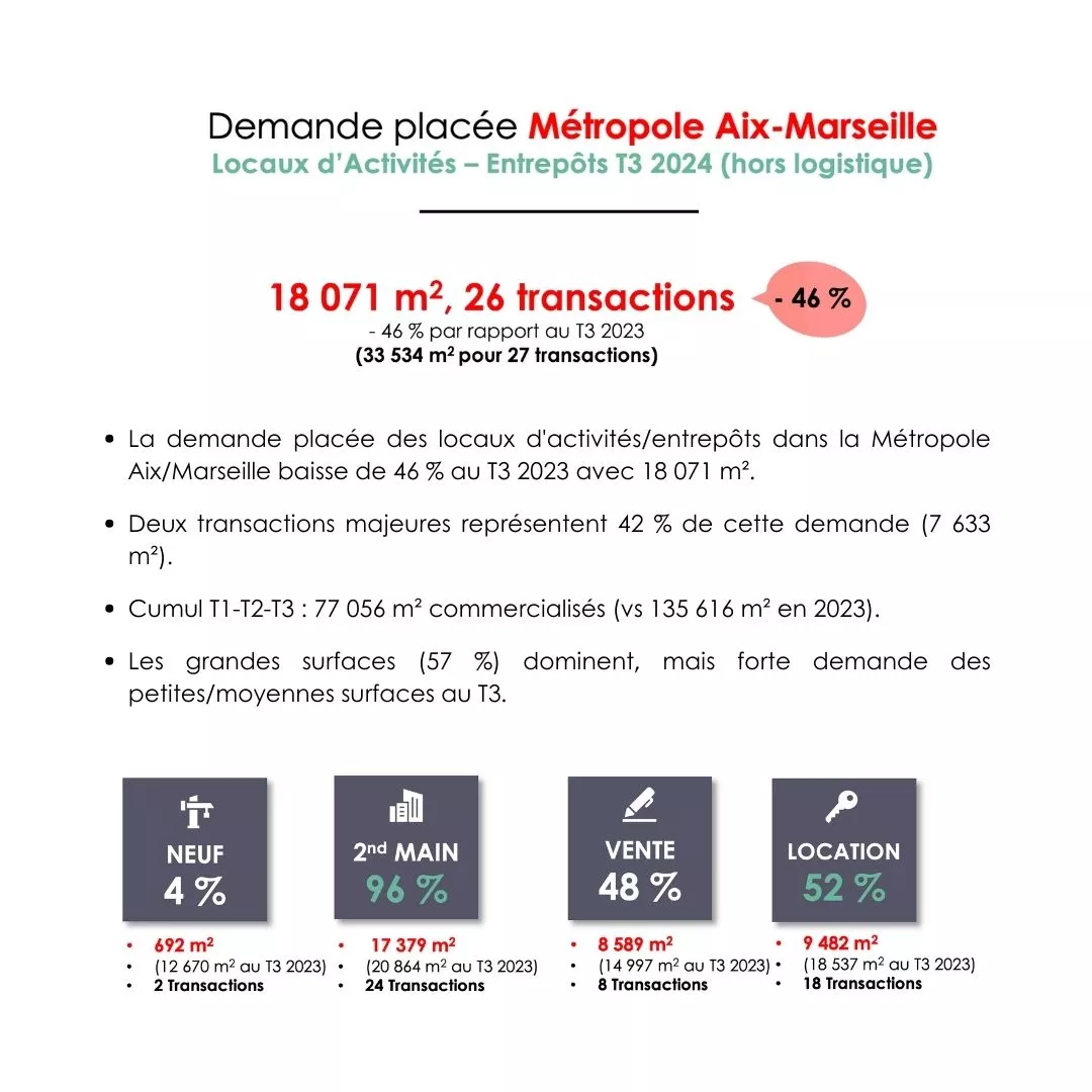 Contrairement au trend du T3 2023, cette année, le grand Marseille représente 79% de la demande placée, vs 21% pour le Pays d’Aix.