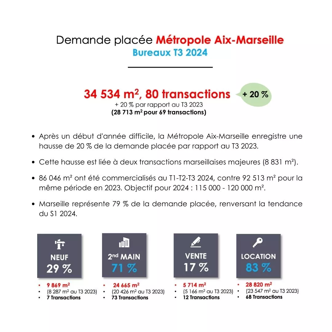 Après un 1er semestre 2024 en retrait, le marché de l’immobilier de bureau de la Métropole Aix-Marseille affiche des résultats en hausse par rapport au T3 2023, pour atteindre 34 534 m2 placés, grâce à 2 transactions significatives dans le secteur de Marseille.
