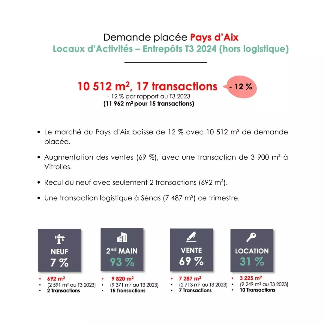 Ce trimestre la demande placée du Pays d’Aix présente une baisse de -18% par rapport au T3 2023.
