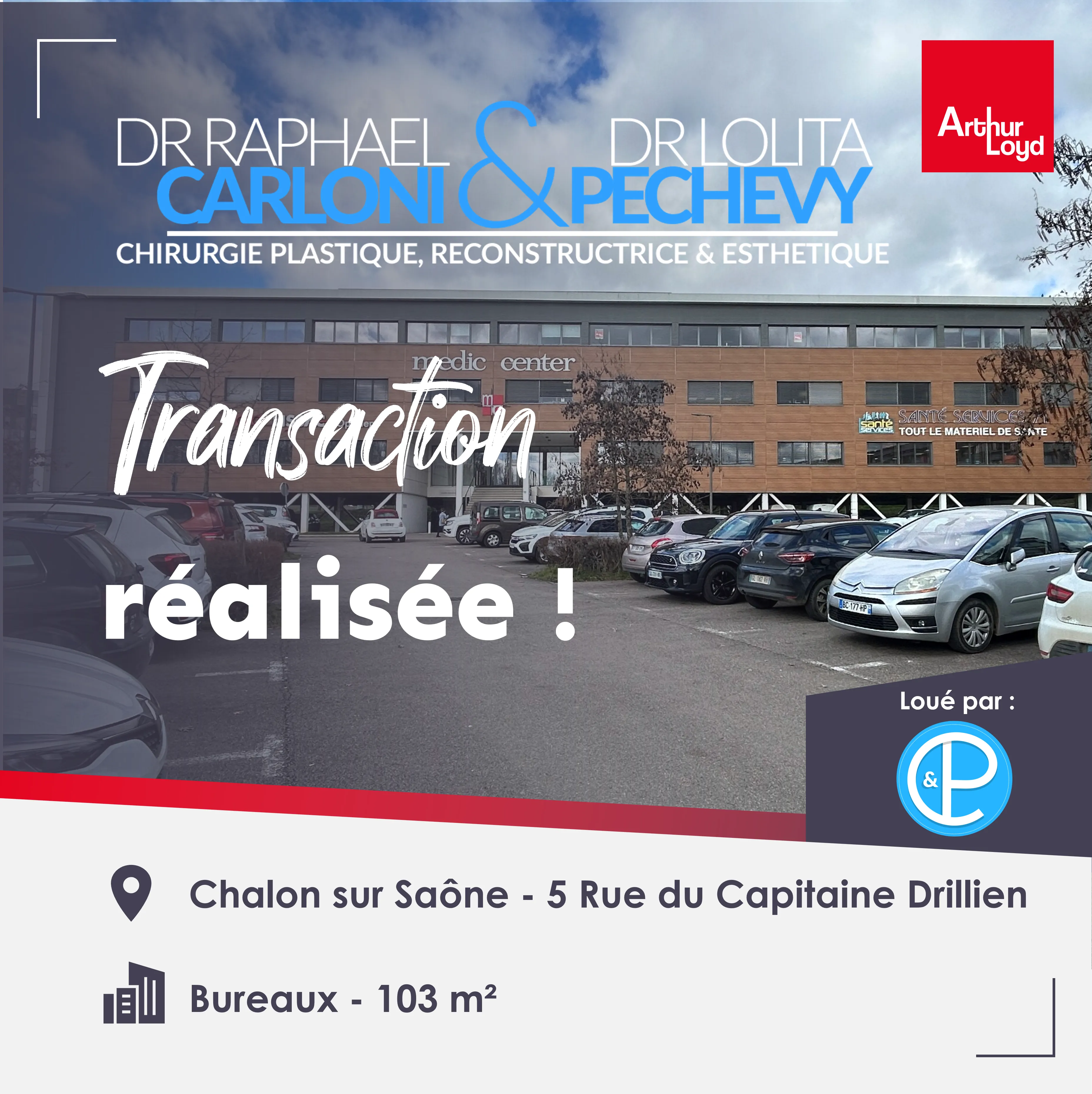 Les Docteurs Raphaël Carloni et Lolita Pechevy, spécialistes en chirurgie esthétique et reconstructrice ont ouverts leur cabinet à Chalon-sur-Saône près du Centre Hospitalier William Morey, au Medic Center dans des bureaux de 100 m² environ.