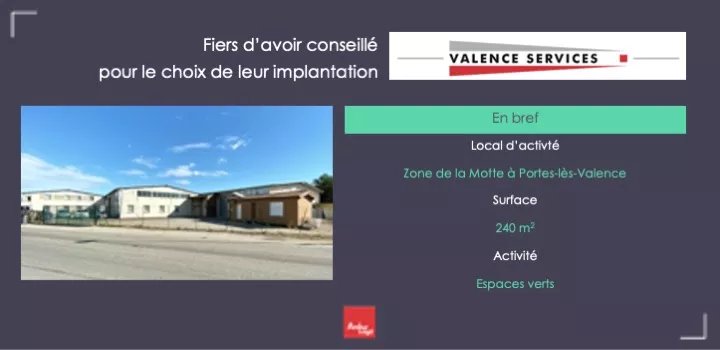 L’activité espaces vert devant s’agrandir, c’est tout naturellement que Valence Services nous recontacte 6 ans après les avoir installés dans la zone des Auréats à Portes-lès-Valence, pour leur trouver un local adapté. Seve paysage s’est alors implanté à Portes-lès-Valence dans la zone industrielle de la Motte, dans un entrepôt de 240m².